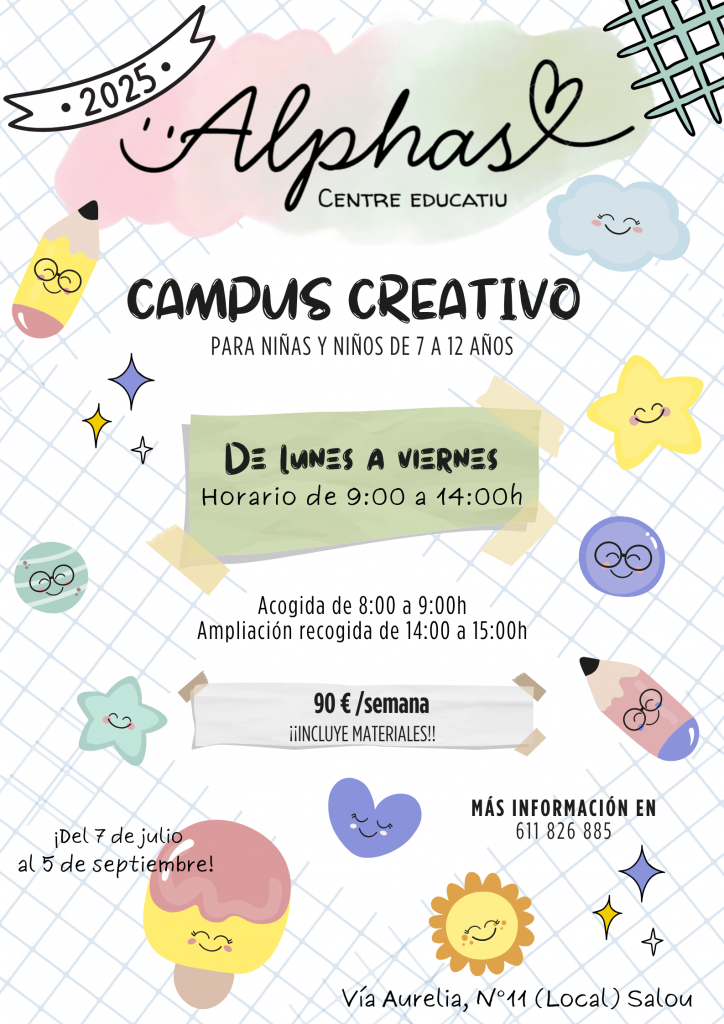 Campus Creativo de Verano «Alphas» en Salou para niños/as de 7 a 12 años. Actividades educativas y lúdicas de lunes a viernes (9:00-14:00h), con horario ampliado de acogida. Incluye materiales por solo 90€/semana, disponible del 7 de julio al 5 de septiembre. ¡Creatividad y diversión aseguradas!